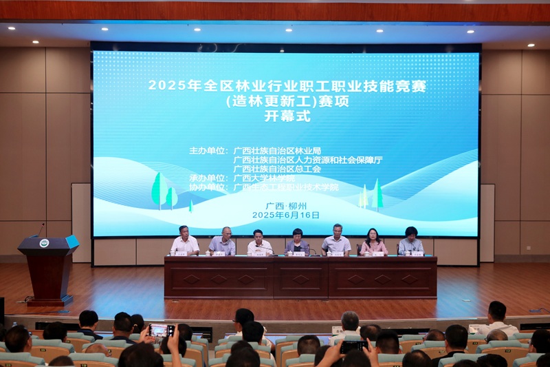 6月16日下午,竞赛开幕式在知行报告厅举行。自治区林业局党组成员、副局长李巧玉致辞强调,广西森林覆盖率达60.2%,林业总产值、人工林面积等五项指标居全国首位,成绩背后是林业技能人才的坚实支撑。赛事以“以赛促学、以赛促训、以赛促评、以赛促建”为目标,不仅是对全区林业职工技能的集中检阅,更旨在为全国林业技能竞赛选拔顶尖选手,为现代林业强区建设注入人才动能。开幕式上,参赛选手代表与裁判代表分别宣誓,确保赛事公平公正。