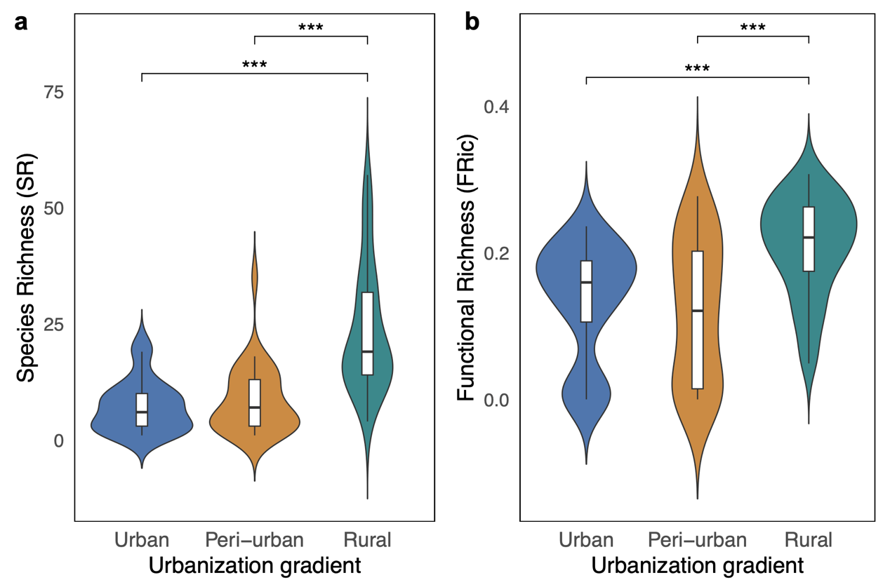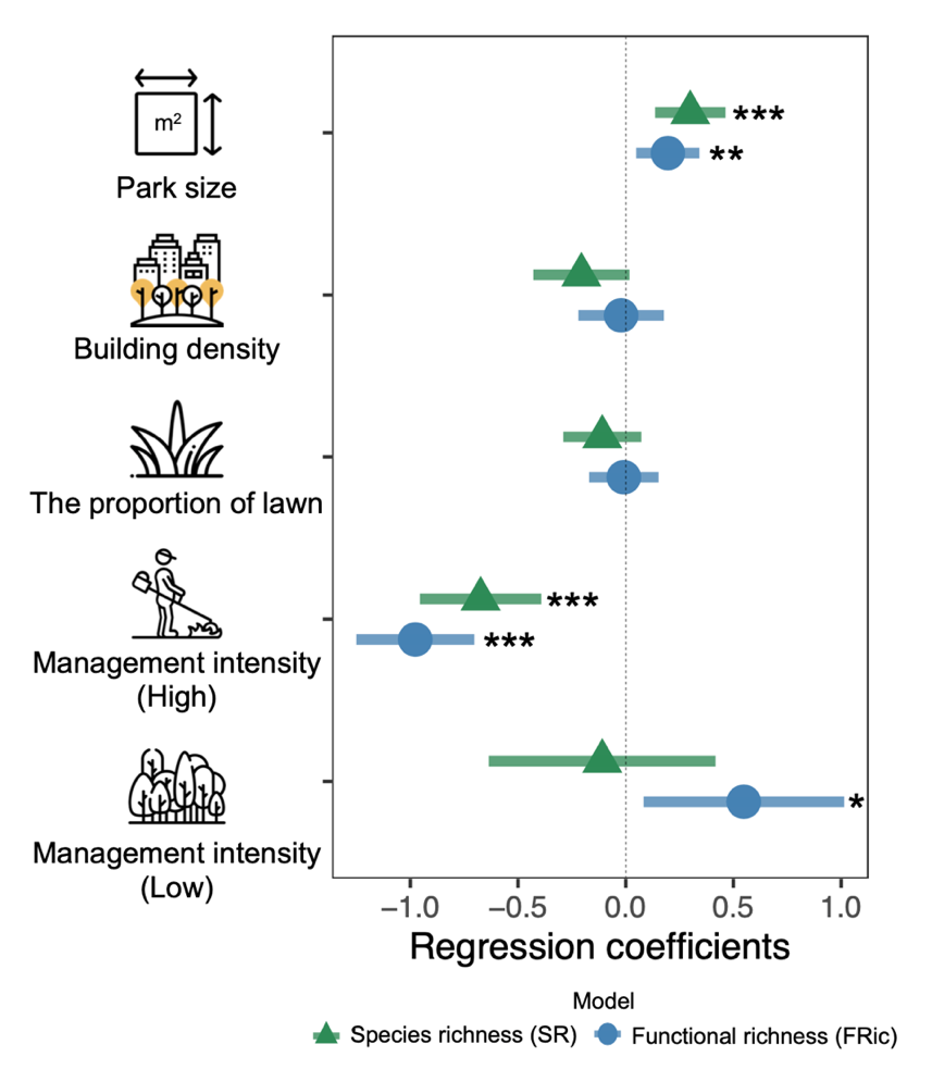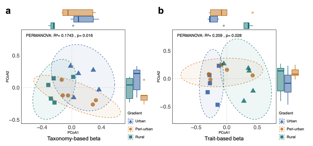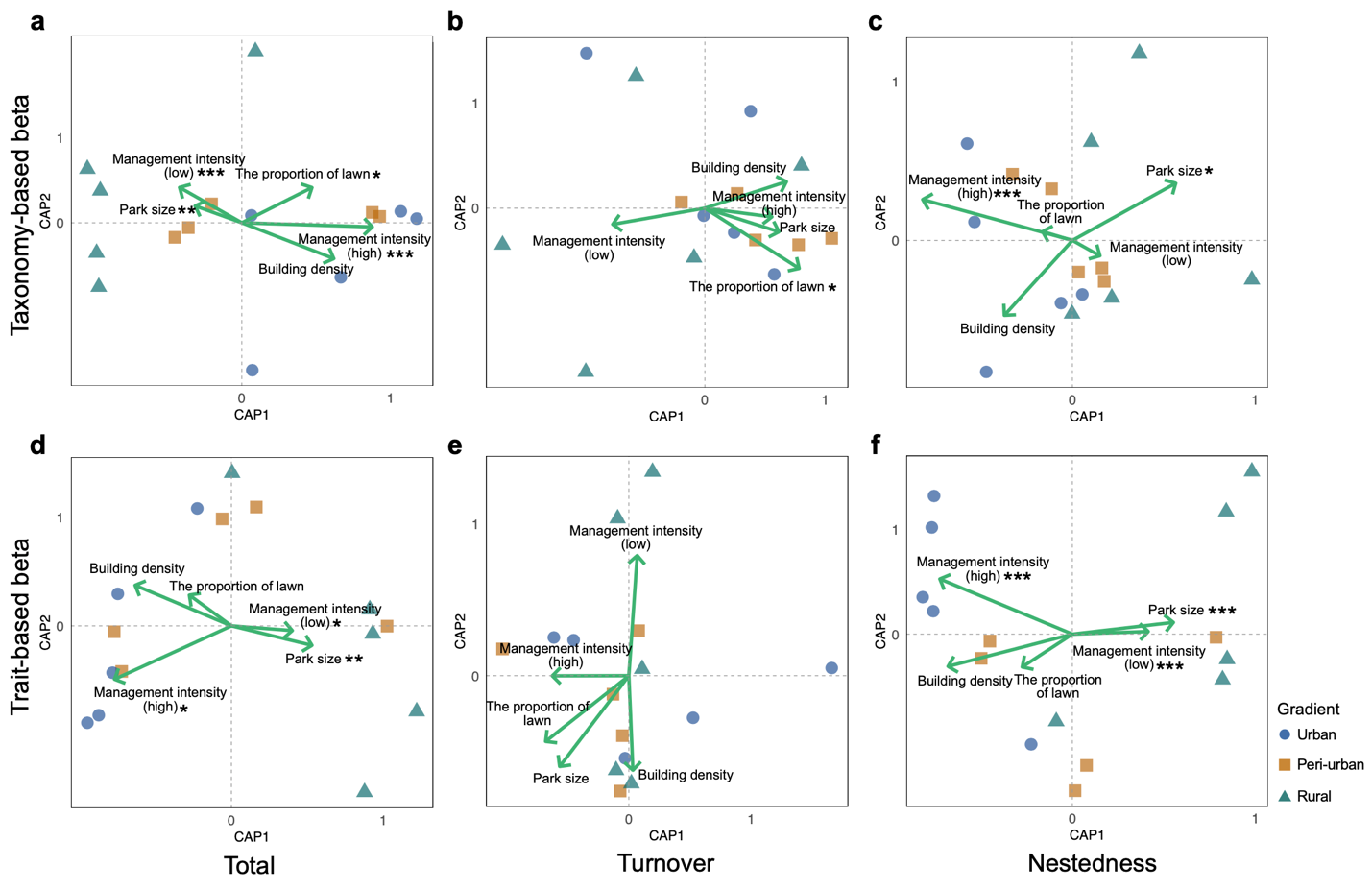 基于分类的β多样性主要由周转(turnover)驱动,而基于性状的β多样性则以嵌套(nestedness)为主要特征,两者的驱动因子不同。其中,人工草地占比主导了分类维度的物种更替,公园面积与不同管理强度则主导了功能丧失与性状趋同。该结果表明城市化促使本地物种消失,被更适应扰动环境的性状组合种类所替代。