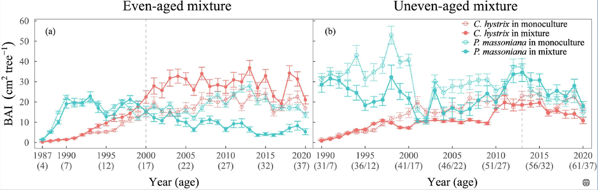一、同龄与异龄混交对树木生长的长期动态影响
