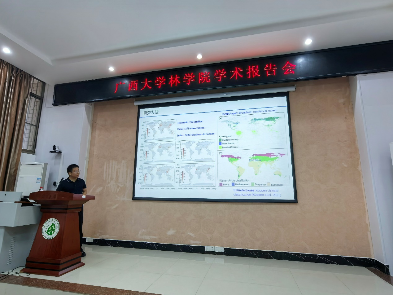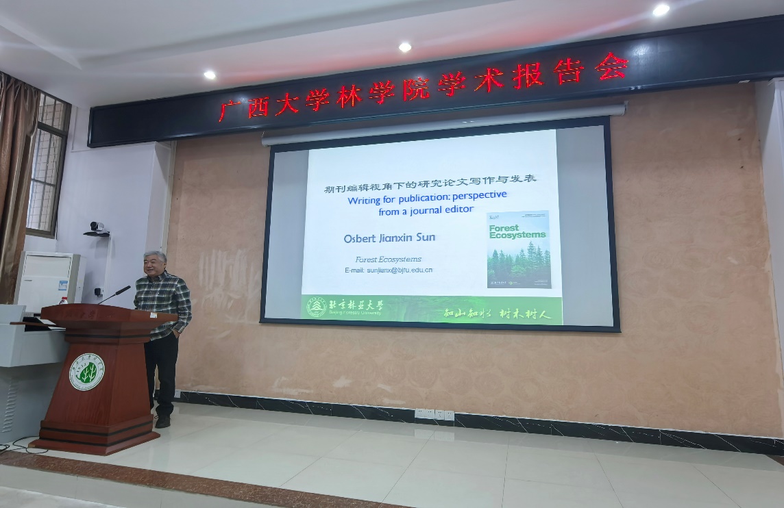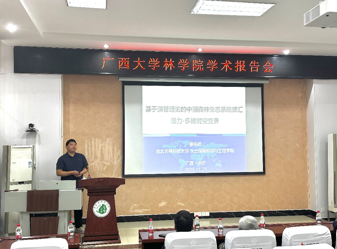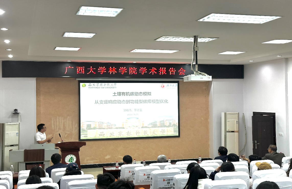 受学院和广西森林生态与保育重点实验室的邀请,北京betway必威西汉姆联官网孙建新教授、西北农林科技大学郭晓伟副教授、蔡伟祥助理教授以及河北大学张雨雪助理教授四位专家莅临我院,共同为我院师生带来一场围绕“森林碳汇评估与科技论文写作”的系列学术报告。本次报告会由我院副院长招礼军教授主持,学院相关教师、研究生及本科生共计一百余人参加了此次学术活动。在学术报告中,四位专家分别从期刊编辑视角、土壤碳循环对全球变化响应机制、森林碳汇潜力估算及土壤碳固持调控等不同维度,系统展示了各自领域的最新研究成果与实践经验。